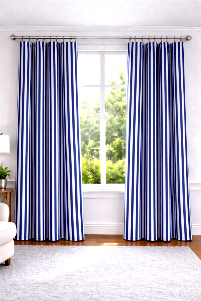 Inspired by timeless blue and white stripes, this design brings a sense of calm brightness into everyday living spaces. The breathable cotton fabric allows natural light to pass through gently while maintaining privacy.