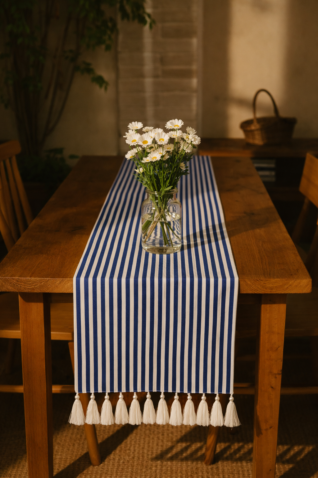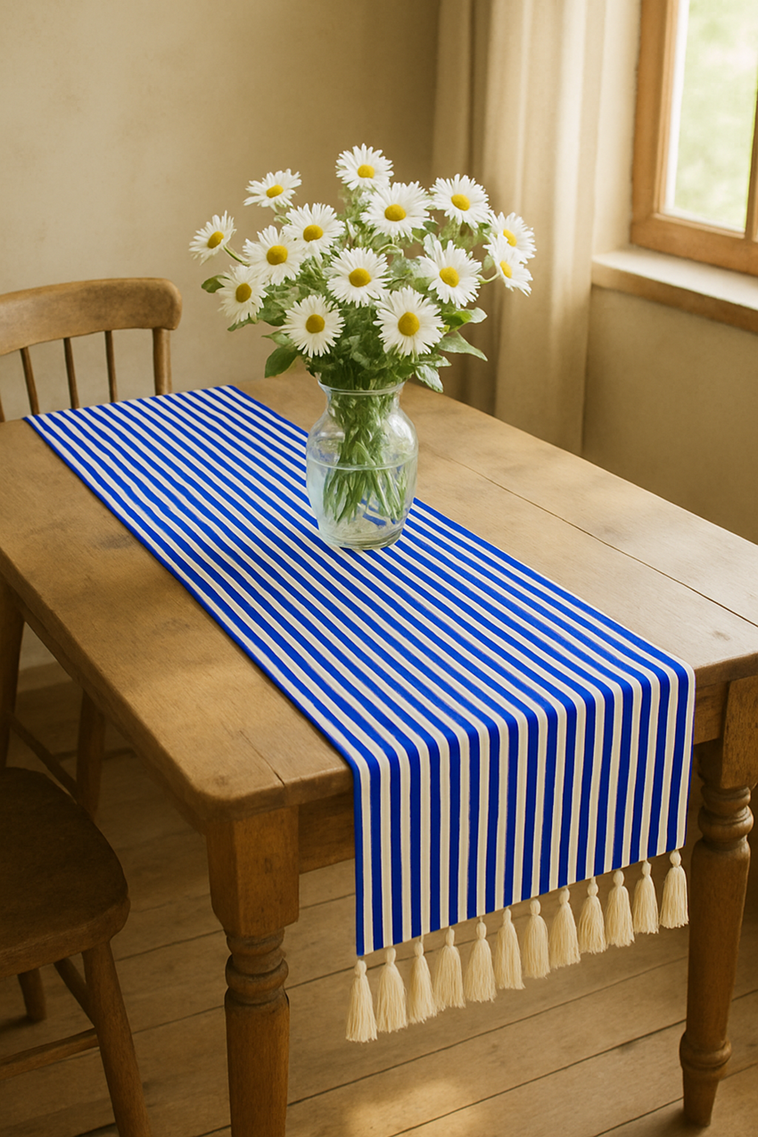 Handcrafted with care, this blue striped table runner is made from high-quality cotton canvas, offering both durability and natural texture. The clean striped design blends modern simplicity with farmhouse warmth, making it perfect for everyday dining, festive styling, or cozy home decor.