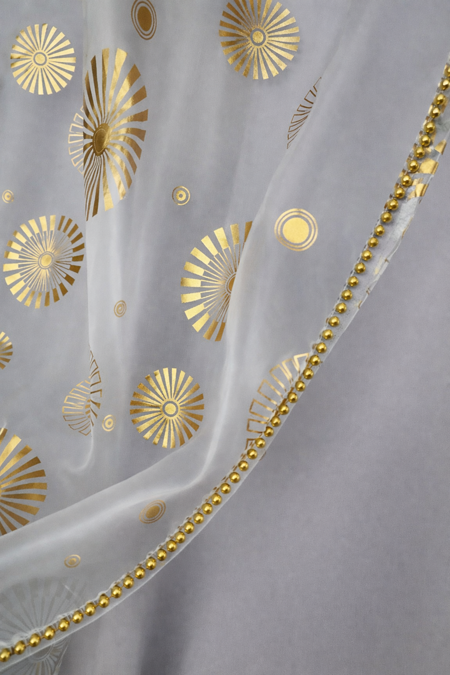 Handcrafted gold embroidery adds warmth and subtle brilliance, while hand-beaded side edges reflect the patience and care behind every piece.